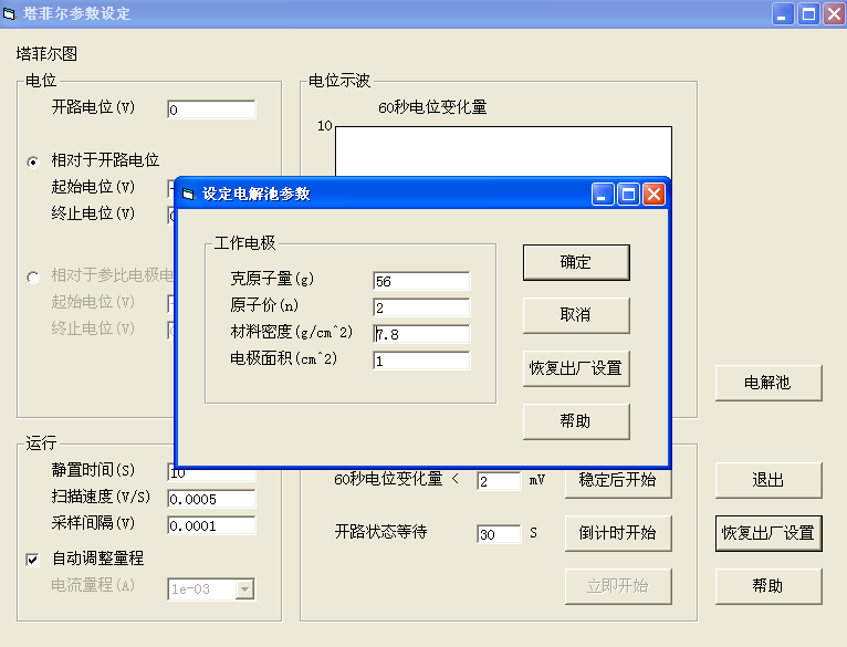 碳鋼采用默認(rèn)電解池參數(shù),如果使用其他工作電極,應(yīng)改變電解池參數(shù)后點(diǎn)擊確定。選定60s電位變化量時(shí)點(diǎn)擊穩(wěn)定后開始,自動(dòng)電位示波,60s內(nèi)電位變化量不大于2mV,自動(dòng)開始掃描。亦可選擇開路狀態(tài)等待。